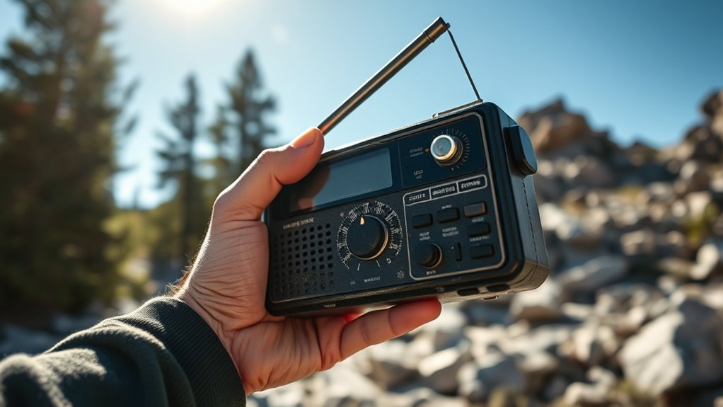 In remote camping, you should know emergency channels like NOAA Weather Radio for alerts, national or regional emergency frequencies, and local park or rescue channels. Most radio devices have dedicated buttons or channels for emergencies, so familiarize yourself before heading out. Using these channels correctly can be lifesaving if you need help. Knowing how to access and operate them ensures you’re prepared when it counts—continue on to discover more essential communication tips for your safety.