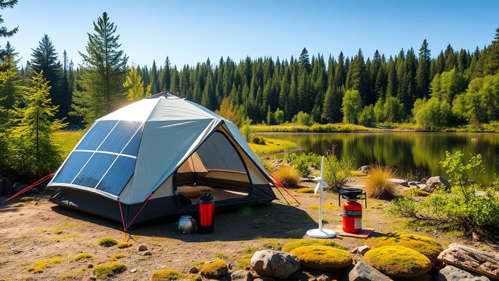Eco-friendly tech is revolutionizing camping by offering sustainable solutions that minimize environmental impact while maintaining comfort. Portable solar panels, solar-powered lanterns, and biodegradable gear help you reduce reliance on non-renewable resources and plastic waste. These innovations make it easier to enjoy the outdoors responsibly, protect ecosystems, and promote conservation. If you want to discover more about these eco-smart camping tools and how they can enhance your adventures, there’s plenty to explore below.