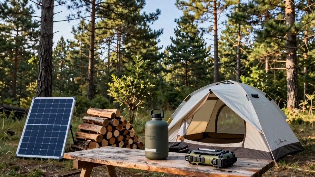 Ever wondered how to stay comfortable and prepared during your off-grid camping adventures? Building a reliable routine means setting up systems that keep you energized, fed, and connected to the essentials without relying on modern infrastructure. One of the most effective ways to do this is by harnessing solar power. Installing portable solar panels allows you to generate electricity on-site, powering your lights, small appliances, and even charging your devices. With solar power, you’re less dependent on batteries or external power sources, making your campsite more self-sufficient. Make certain your solar setup is lightweight, durable, and positioned to maximize sunlight exposure. Regularly clean your panels and keep a backup power bank handy for cloudy days or low sunlight periods. This way, your routine becomes more dependable, and you can focus on enjoying nature without constant worry about power outages. Proper solar power setup is essential for ensuring reliable energy during your trip. Food storage is another critical aspect of a reliable off-grid routine. Properly storing your food prevents spoilage and attracts fewer pests, which keeps your campsite cleaner and safer. Invest in high-quality, airtight containers that protect your supplies from moisture and critters. Consider a small, portable cooler with ice packs for perishables, but also explore non-perishable options like dehydrated meals, canned goods, and vacuum-sealed snacks. Having a systematic approach to food storage ensures you always have access to fresh-tasting, safe food, no matter how long your trip lasts. Keep a detailed inventory to track what’s available and what needs replenishing, so you don’t run out unexpectedly. Incorporate a routine of checking and reorganizing your food storage daily, which helps maintain hygiene and prevents spoilage. Establishing a predictable daily schedule also contributes to a more reliable off-grid routine. Wake up and go to bed at consistent times, aligning your activities with daylight hours. Use your solar power setup to light your space efficiently and safely after dark. Prepare your meals in advance when possible, using your stored food supplies, and plan your activities around natural light to maximize energy and enjoyment. Regularly assess your gear, water, and supplies to avoid surprises, and keep emergency equipment easily accessible. Incorporating solar energy into your routine can further enhance your campsite’s self-sufficiency by reducing reliance on external sources. Additionally, understanding basic energy storage techniques can help you better manage power during periods of low sunlight. Implementing reliable power management strategies allows you to optimize energy use and prevent unexpected outages, ensuring a smoother camping experience. By creating this structured approach, you reduce stress and increase your ability to adapt to unforeseen circumstances.