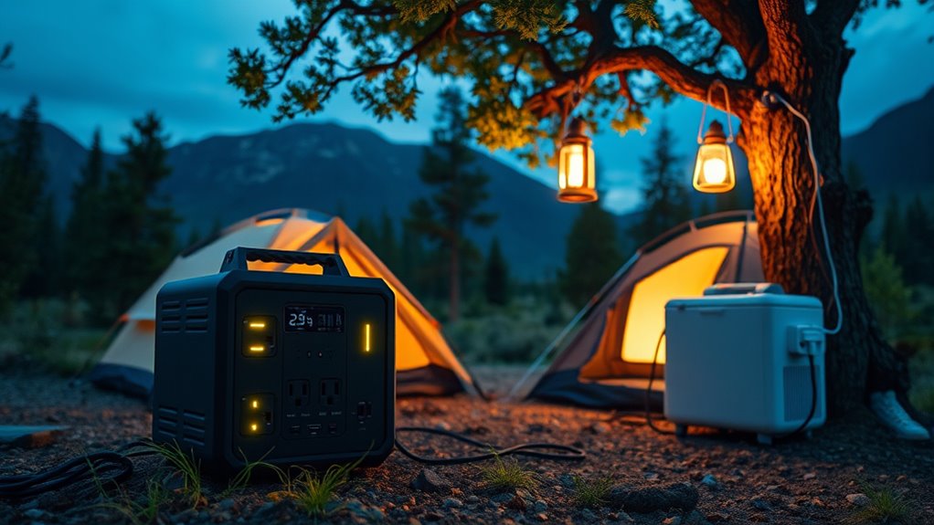 Managing your power usage effectively is essential to keep your devices running smoothly throughout your camping trip. To maximize energy efficiency, prioritize charging devices during daylight hours using your solar panel, which harnesses free, renewable energy. Turn off devices when not in use and avoid leaving them on standby, as this wastes power. Use your power station’s settings to monitor consumption and adjust accordingly. Conserve energy by unplugging unnecessary gadgets and limiting the use of high-power appliances. Planning ahead guarantees your power station can meet your needs without draining quickly. Efficient power management not only extends your station’s runtime but also reduces the need for frequent recharging, ensuring you stay connected and powered throughout your outdoor adventure.