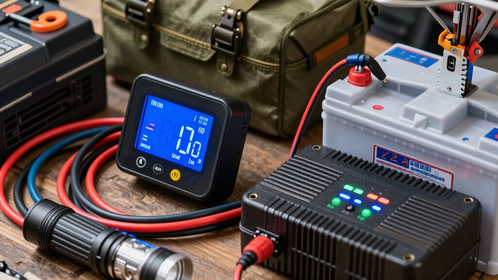 When you’re vehicle camping, having reliable power is fundamental for comfort and safety. You’ll want to keep your devices charged, run small appliances, and guarantee your lighting stays on through the night. That’s where battery monitors and DC chargers come into play. They help you manage your power system efficiently, making sure you’re never caught off guard with a dead battery. A quality battery monitor gives you real-time data on your battery’s state of charge, voltage, and current draw. With this information, you can prevent over-discharging, which is essential for extending your battery’s lifespan. This proactive approach is critical for maintaining your batteries over the long haul, especially if you’re relying on deep-cycle batteries that need careful management. Properly integrated power management tools can further optimize your energy use and ensure your setup remains reliable. Additionally, understanding the importance of contrast ratio in your system can help you select compatible components that improve overall performance. Maintaining correct charger settings based on your battery type, such as LiFePO4, ensures safe and efficient charging, preventing damage and maximizing lifespan. Using a battery management system can also help automate and improve the safety of your power setup. Incorporating a comprehensive understanding of electrical characteristics can help you troubleshoot and enhance your system’s efficiency.