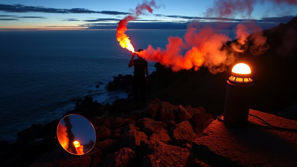 Choosing between flares, mirrors, or beacons depends on your environment and needs. Flares are bright and visible from a distance but are best suited for daylight or clear weather. Mirrors reflect sunlight but require good timing and line of sight. Electronic beacons are reliable day or night, transmitting precise locations with minimal effort. Knowing when and how to use each can boost your chances of rescue—keep going to discover more helpful tips.