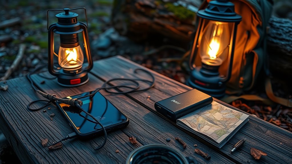 Solar-powered lights offer a reliable, eco-friendly way to illuminate your campsite without relying on batteries or electricity. These lights harness renewable energy from the sun, making them an excellent backup option when electronic devices fail. These lights are especially beneficial for those practicing digital minimalism, as they help reduce screen time and reliance on electronic gadgets. Simply place them in a sunny spot during the day, and they’ll charge automatically. At night, they provide steady, ambient light without the need for power outlets or extra batteries. Solar-powered lights come in various styles, from lanterns to string lights, giving you flexibility in lighting your campsite. They’re durable, low-maintenance, and environmentally conscious, helping reduce your carbon footprint. With solar-powered lights, you guarantee your campsite stays lit comfortably, even when your main electronic sources are unavailable. They’re a smart addition to any tech-free backup plan. Additionally, many solar lights are designed with weather-resistant features, ensuring they can withstand the outdoor elements and provide reliable illumination over time. Incorporating solar energy into your camping setup not only enhances sustainability but also ensures consistent lighting when traditional power sources are inaccessible.
