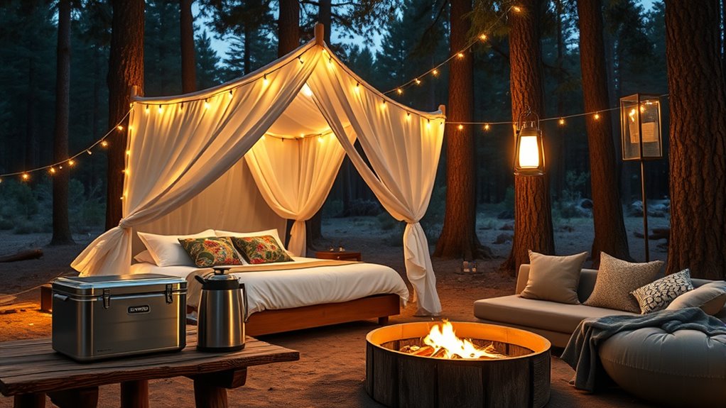 To turn your camp into a glamorous glamp, you can add smart gadgets like high-tech tents with climate control, cozy luxury mattresses, and smart lighting for ambiance. Portable power stations and solar chargers keep your devices alive, while outdoor security cameras guarantee safety. Enhance comfort with stylish furniture, temperature control devices, and compact kitchen gear for gourmet meals. Want to discover more ways to upgrade your outdoor escape? Keep exploring for the full list of luxury upgrades.