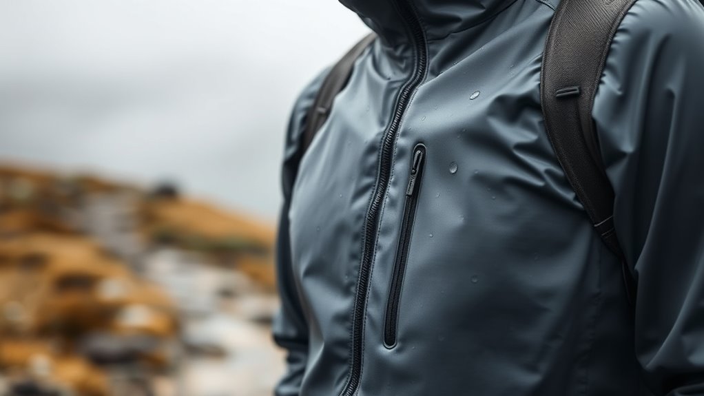 All-weather jackets use advanced tech fabrics that keep you dry by blocking external moisture like rain and snow, thanks to waterproof coatings and membranes. At the same time, these fabrics breathe to reduce sweat buildup, preventing overheating and discomfort. Lightweight yet durable, they adapt to changing weather, ensuring you stay comfortable whether you’re hiking or commuting. Want to discover how these innovative materials work together to protect you in any weather? Keep exploring to find out more.