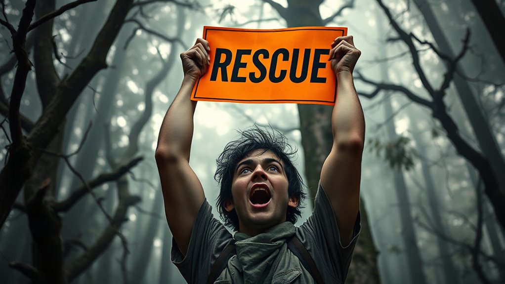 What if your distress signals go unnoticed? You should try to improve your visibility and sound, using loud noises, bright colors, or reflective objects. Keep repeating your signals calmly, and watch for signs of rescue coordination. Remember, persistence is key. If rescuers don’t hear you, stay patient, stay active, and continue your efforts—your consistent signals increase the chances they’ll find you.