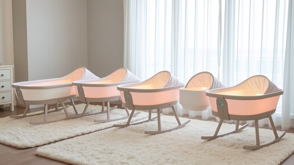 When selecting an auto-rocking bassinet with cry detection, I pay close attention to its motion customization options because they can make a significant difference in soothing my baby effectively. I look for models with multiple speed settings so I can adjust the gentle rocking to suit my baby’s preference. Some bassinets offer different motion patterns, like side-to-side or front-to-back swings, which can mimic comforting behaviors and improve sleep quality. Programmable timers and automatic adjustments based on crying cues are also helpful, allowing the bassinet to respond dynamically. Being able to fine-tune the rocking speeds and patterns ensures the bassinet adapts to my baby’s changing needs and development stages, offering a personalized soothing experience that promotes peaceful nights for both of us.