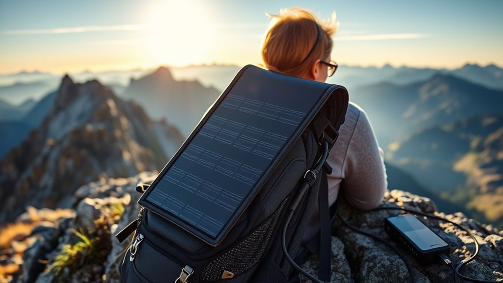 Selecting the right port types on a backpacking solar charger is essential for guaranteeing compatibility with all my devices. I look for chargers with multiple output options like USB-A, USB-C, and DC ports so I can power everything from smartphones to larger gadgets simultaneously. Foldable designs with integrated carabiners or straps make attaching the charger to my backpack quick and easy during outdoor activities. High conversion efficiency, around 23-24%, helps maximize power in limited sunlight, which is vital when conditions aren’t ideal. I also pay attention to power output ratings—30W, 50W, or higher—to guarantee the charger can reliably support my devices’ energy needs. This combination of port variety and efficiency makes my off-grid setup flexible and dependable.