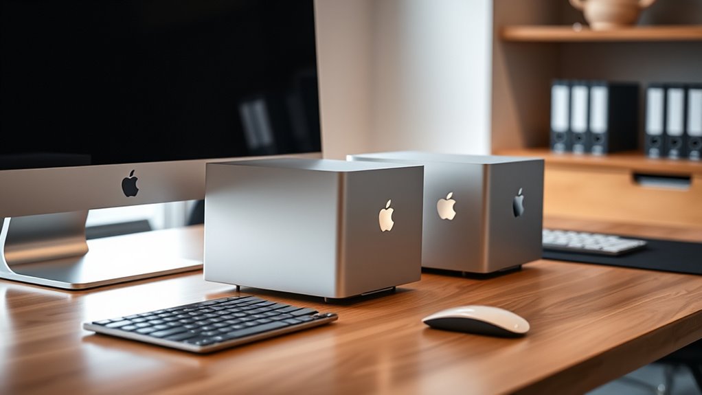 To boost my compact Mac workstation productivity, I rely on high-quality accessories. I swear by a sleek external monitor for extra screen space, a precise wireless keyboard and mouse for comfort, and a compact external SSD for fast storage. A good docking station helps connect all devices seamlessly, while noise-canceling headphones keep me focused. These tools make my workflow smoother, more efficient, and help me stay productive on the go.