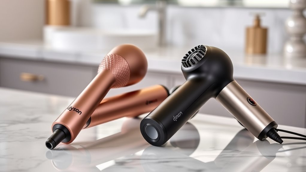 Selecting the right Dyson Airwrap alternative involves paying close attention to the attachments and accessories it offers. Compatibility is key—ensure they fit your specific model for proper use and ideal results. Different attachments, like diffusers, barrels, and brushes, serve unique purposes such as curling, volumizing, or drying. Some models feature bidirectional or automatic functions, making styling more versatile and effortless. Material quality and heat resistance are also important; high-quality, heat-resistant attachments last longer and protect your hair from damage. Finally, check if the device offers a range of compatible accessories, as this enhances customization and overall styling options. A well-rounded set of attachments makes your styling routine more efficient and tailored to your hair needs.