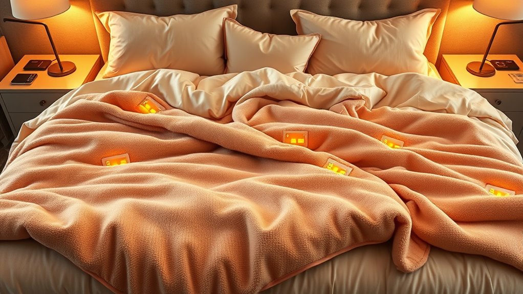 Safety certifications like ETL and FCC are essential because they confirm that the electric blanket meets strict safety standards, giving you peace of mind. These certifications guarantee the product has been tested for electrical safety and compliance, reducing risks of fire or electric shock. Look for overheat protection features that automatically shut off or lower heat to prevent local overheating and hazards. An adjustable auto-off timer, ideally between 1 to 12 hours, adds an extra layer of safety during use. Dual control systems should allow independent temperature settings, ensuring both users can customize their comfort safely. Additionally, check that wiring and heating elements are designed with safety in mind, such as U-shaped coils, which promote even heat distribution and minimize risks. These features help ensure a safe, cozy experience.