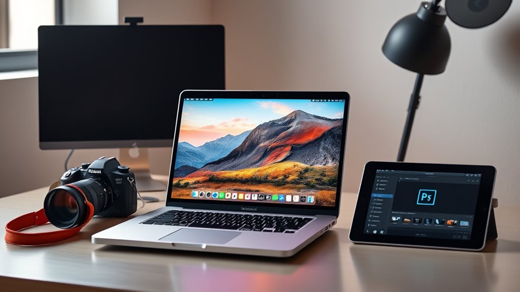 Processing power and RAM play a vital role in guaranteeing your MacBook Pro can handle large Lightroom catalogs and high-resolution images without lag. I recommend at least 16GB of RAM for smooth multitasking and efficient editing, especially when working with complex layers, masks, or extensive adjustments. Higher processing power, like a 10-core CPU or better, markedly reduces rendering times and speeds up your workflow. Modern MacBook Pros with Apple Silicon chips leverage unified memory, providing faster data access and optimized performance. For professional photographers, models with 32GB or more of RAM and higher core counts offer future-proofing and handle demanding tasks effortlessly. Prioritizing these specs ensures your MacBook Pro remains responsive, even during intensive editing sessions.