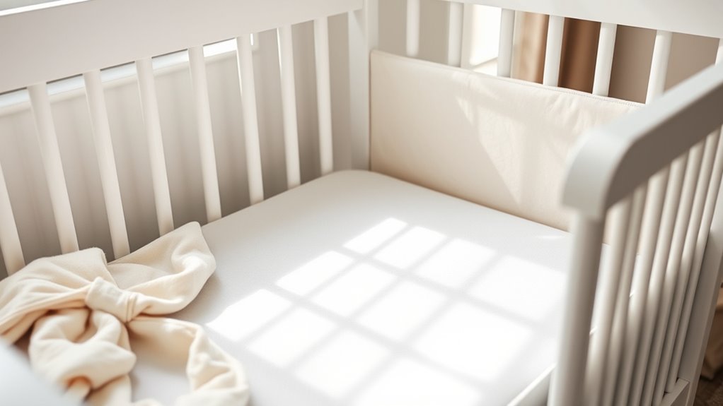 Ensuring a crib mattress provides the right firmness and support is vital for your baby’s safety and well-being. A firm mattress helps maintain proper spinal alignment, which is essential for healthy growth. It also greatly reduces the risk of Sudden Infant Death Syndrome (SIDS), as a softer mattress can pose suffocation hazards. When choosing a non-toxic crib mattress, look for one that offers consistent firmness without sagging or indentations. Avoid overly soft or plush models that can compromise safety. A firm, supportive mattress guarantees your baby sleeps safely and comfortably, giving you peace of mind. Remember, the goal is to find a balance—firm enough to support healthy development but comfortable enough for restful sleep. Your baby’s safety depends on it.