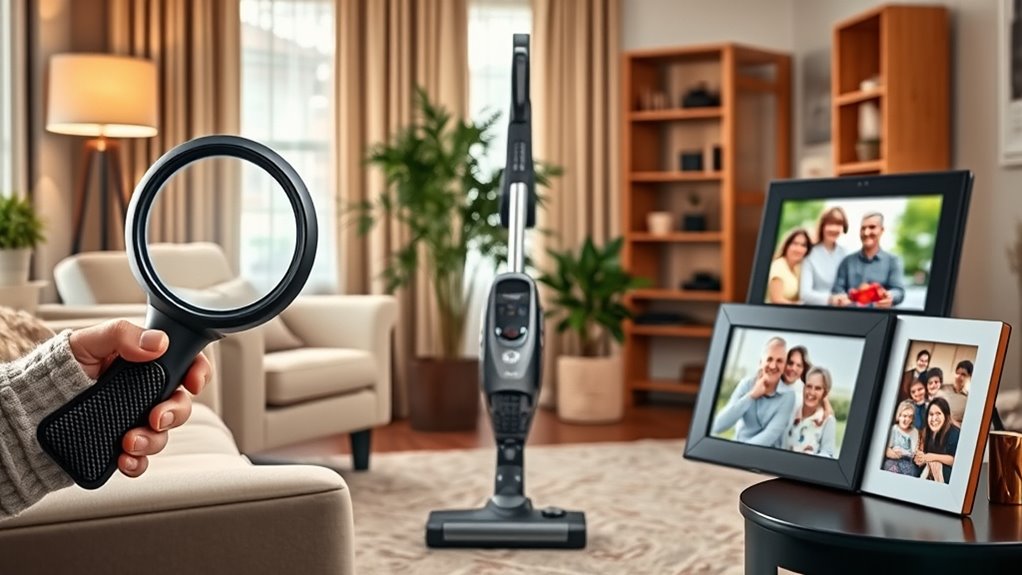 Think of it like the safety nets woven into the fabric of a tightrope walker’s act. I always look for practical gifts with features like non-slip soles, sturdy handrails, or automatic shut-off. These safety features aren’t just extras—they’re essential for peace of mind. I prioritize items with clear, easy-to-use controls and sturdy construction, ensuring my parents feel confident and secure in their daily routines.
