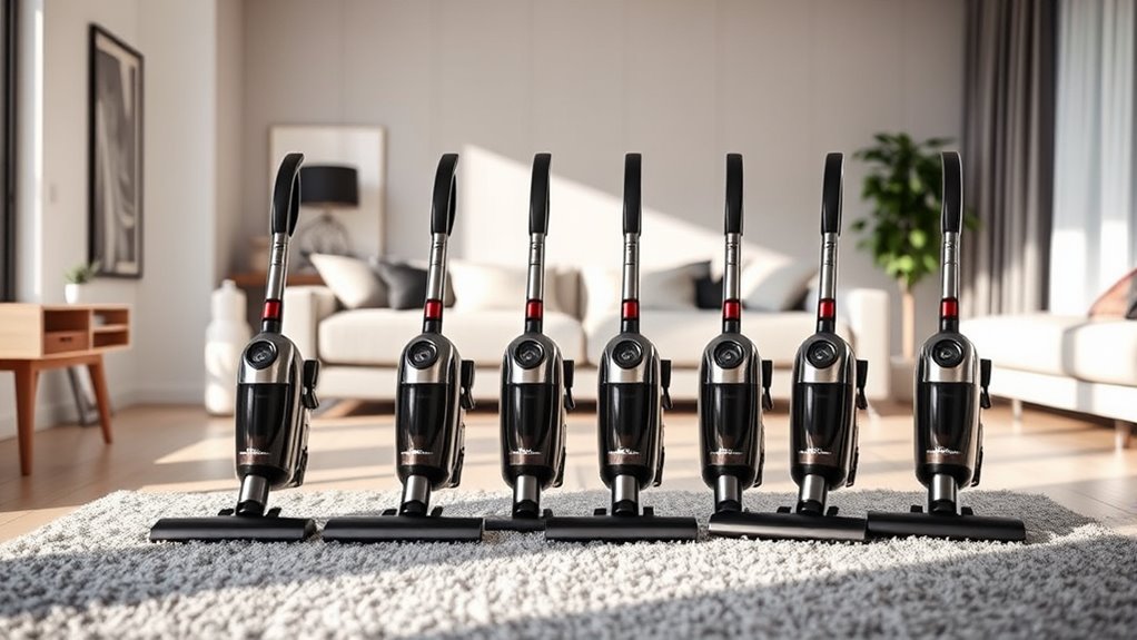 Choosing a lightweight vacuum is essential for apartment living because it makes cleaning less tiring and more manageable. Canister vacuums weighing between 10 to 22 pounds are ideal, as they’re easier to carry and maneuver through tight spaces. A swiveling or 360-degree rotating head considerably boosts maneuverability, letting you navigate around furniture effortlessly. Telescoping wands that extend several feet help reach high or tricky spots without straining your back. Compact designs with ergonomic handles also reduce fatigue during long cleaning sessions. When combined with flexible steering features, a lightweight vacuum minimizes effort even in confined areas. This ease of use not only saves energy but also encourages more frequent cleaning, keeping your apartment spotless without the hassle.