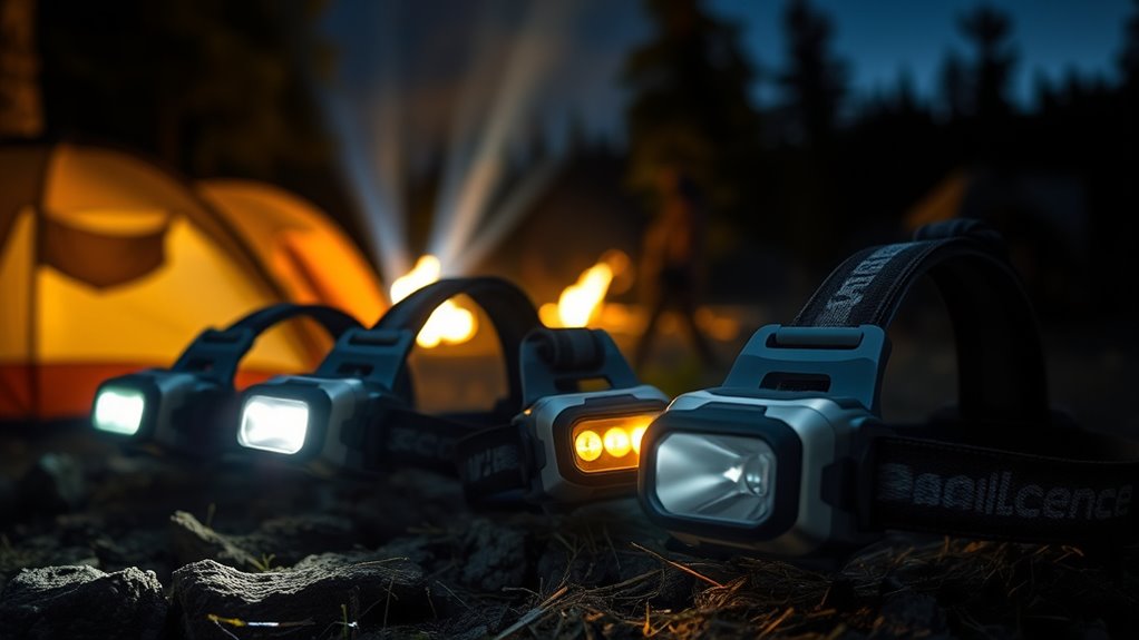 Selecting a comfortable and well-fitting headlamp is essential for a hassle-free camping experience. An adjustable headband guarantees a secure fit for different head sizes, preventing slipping during active movement. Padded or elastic straps help distribute pressure evenly, reducing discomfort during long hours of wear. Opting for a lightweight headlamp, under 3 ounces, minimizes strain on your head and neck, especially during extended use. A tiltable or pivotable lamp head lets you customize the lighting angle, making tasks easier and more comfortable. Additionally, headbands made from breathable, washable, and moisture-wicking materials keep you comfortable and fresh, even in sweaty outdoor conditions. Prioritizing comfort and fit ensures you’ll enjoy your camping adventure without the distraction of ill-fitting gear.