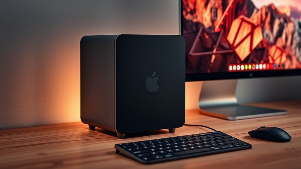 Renewed Mac Studio desktops use advanced internal cooling solutions, including efficient heat sinks and active airflow systems, to keep the high-performance components cool. I’ve found that Apple’s design prioritizes ideal thermal management, ensuring consistent performance during intensive tasks. The cooling is quiet and effective, allowing me to work smoothly without worrying about overheating. Overall, the cooling solutions are well-engineered, balancing power and noise levels for a seamless user experience.