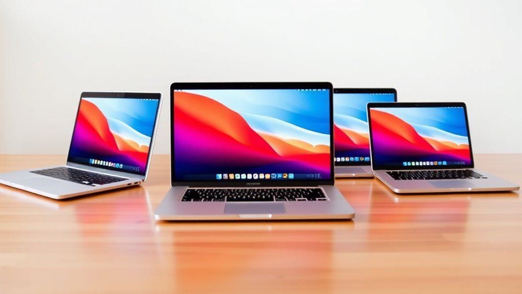Ensuring your renewed MacBook Air integrates smoothly with your existing Apple devices is essential for a seamless experience. You should verify that it supports features like iPhone mirroring, Messages, and FaceTime, so your workflow remains uninterrupted. Check that the macOS version on the device aligns with your preferred applications, ensuring compatibility and security. Confirm that the MacBook supports Continuity and Handoff, which allow effortless task sharing across your Apple ecosystem. Additionally, examine whether it includes necessary accessories or ports like Thunderbolt 4 or MagSafe, matching your peripheral needs. Finally, consider the device’s security and privacy features, as these are optimized within the Apple ecosystem to protect your data consistently across all devices. This compatibility guarantees a smooth, integrated user experience.