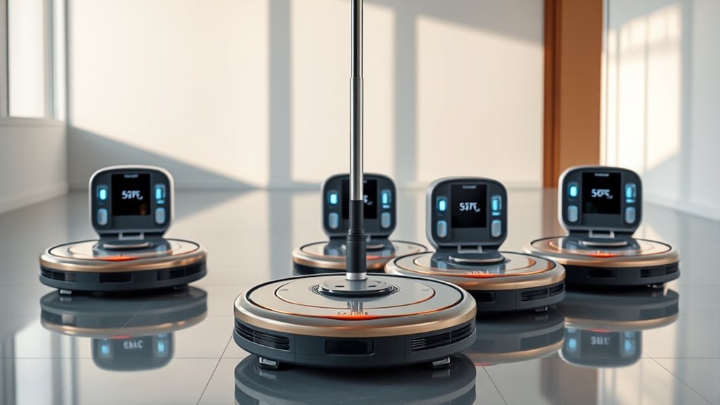 Ever wonder how robotic mops navigate complex home layouts so efficiently? Advanced navigation and mapping tech, like LiDAR or gyroscope sensors, allow these devices to create precise, multi-level maps of your home, guaranteeing thorough cleaning. Real-time obstacle detection helps them steer clear of furniture, cords, and other objects, preventing getting stuck or missing spots. Multi-floor mapping capabilities enable the robot to recognize different levels, making cleaning more efficient across your entire home. You can also set virtual boundaries and no-go zones through apps, keeping the robot away from restricted areas. Plus, continuous map updates during cleaning sessions help the robot adapt to furniture changes or new obstacles, maintaining ideal coverage. This technology ensures your robotic mop cleans smartly and effectively, saving you time and effort.