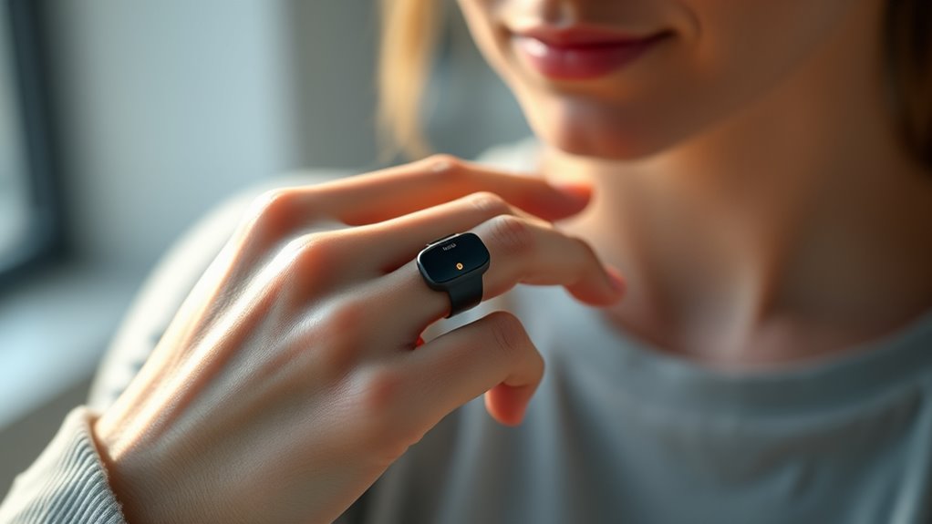 Choosing a smart ring for fitness tracking means prioritizing both style and comfort, so it seamlessly fits into your daily routine. I look for a sleek, lightweight design, often made from materials like titanium or ceramic, to guarantee all-day comfort. The slim profile, around 2-7mm thick, is essential so it doesn’t interfere with daily activities or sleep. Style options range from minimalist, discreet designs to more colorful or textured finishes, allowing me to match my personal taste. Hypoallergenic materials are a must for sensitive skin, and surface textures or color choices can enhance the ring’s appearance without sacrificing functionality. Ultimately, selecting a ring that looks good and feels comfortable helps me stay consistent with my fitness tracking.