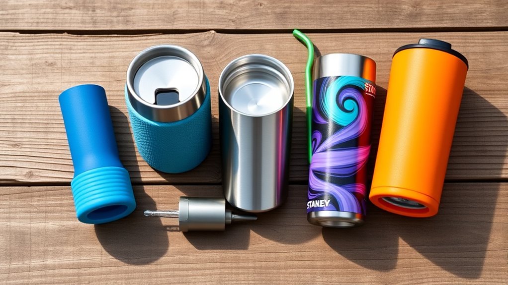 If you want to boost your hydration with your Stanley Tumbler, I recommend trying the 12-piece Christmas accessory set for festive flair, durable stainless steel replacement straws for style and convenience, fun butterfly straw covers to prevent spills and add charm, a strap or boot for extra protection, and a versatile, leak-proof lid for every activity. Each piece is designed for durability, style, and ease of use. Keep going if you want to discover how these accessories truly elevate your hydration game.