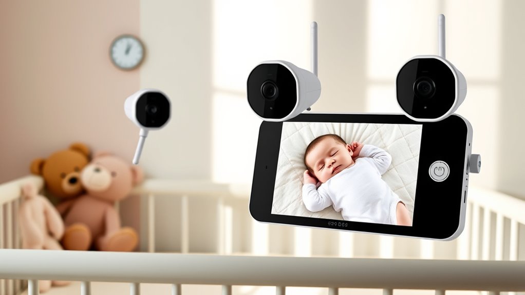 Think of these monitors as a vigilant eagle with sharp eyes, effortlessly switching between different angles. They handle multiple camera views with ease, allowing me to see various parts of the room or multiple cribs on one screen. Some models even let me customize viewing angles or set automatic rotations. This flexibility guarantees I can keep a close watch on every corner, giving me peace of mind and a clearer picture of my little one’s safety.