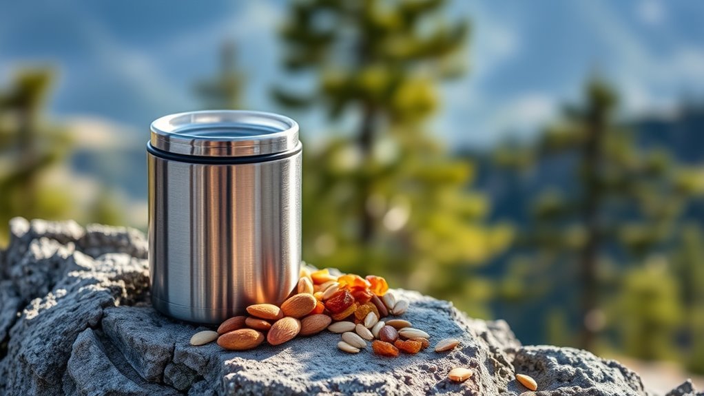 Keeping your trail mix fresh and safe from spoilage requires temperature-controlled storage solutions, especially during long hikes or camping trips. Proper temperature regulation ensures your food stays crisp and prevents mold or bacterial growth. Climate control options like insulated containers or portable mini-fridges maintain consistent temperatures, protecting perishable items. Modern tech devices, such as battery-powered coolers, let you monitor and adjust temperature settings in real time. These solutions are ideal for preserving delicate ingredients or keeping snacks fresh in varying outdoor conditions. Implementing reliable temperature regulation reduces the risk of spoilage and extends the shelf life of your trail food. Additionally, integrating temperature regulation into your gear choices helps you select sustainable and budget-friendly climate control options. Whether trekking through hot deserts or chilly mountains, climate control keeps your fuel fresh and ready to energize your adventure. Incorporating digital temperature monitoring can further enhance your control over storage conditions, ensuring your food remains at optimal freshness levels regardless of changing environments. Using advanced temperature sensors can also provide early warnings of potential temperature fluctuations, helping you respond quickly to maintain food safety.