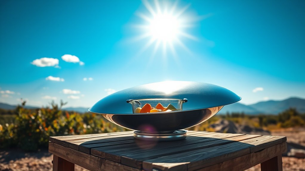 Using solar cookers offers numerous benefits that make them an attractive alternative to traditional cooking methods. They enhance cooking efficiency by harnessing free, renewable solar energy, reducing reliance on electricity or gas. Plus, solar safety is a major advantage—there’s no risk of burns from open flames or hot surfaces. Solar cookers also help save money on fuel costs and lower your carbon footprint. The table below summarizes key benefits: